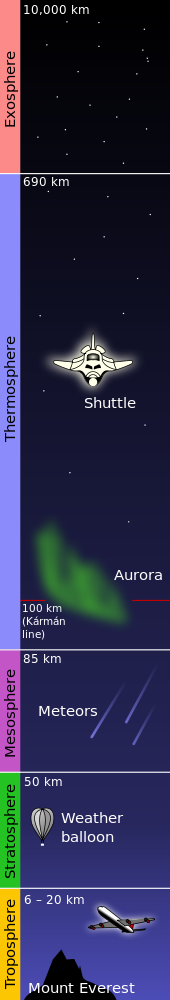 Most orbital flight actually takes place in upper layers of the atmosphere, especially in the thermosphere (not to scale)