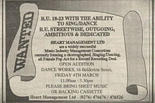 In the mid-1990s, family management team Bob Herbert, Chris Herbert and Lindsey Casbon set about creating a girl group to compete with popular boy bands that dominated the pop music scene in the mid- to late-1990s: "The whole teen-band scene at the time was saturated by boy bands like Take That and East 17. That was all a bit of a yawn for me, and only appealed to female audiences...I felt if you could appeal to the boys as well, you'd be laughing." In February 1994, Heart Management – which comprised the Herberts together with financier Chic Murphy – placed an advertisement in The Stage trade magazine asking "WANTED: R.U. 18–23 with the ability to sing/dance? R.U. streetwise, outgoing, ambitious, and dedicated? Heart Management Ltd. are a widely successful music industry management consortium currently forming a choreographed, singing/dancing, all-female pop act for a recording deal. Open audition. Danceworks, 16 Balderton Street. Friday 4 March. 11 am-5:30 pm. Please bring sheet music or backing cassette". About 400 women who answered the ad went to Dance Works studios. There, they were put into groups of 10 and danced a routine to "Stay" by Eternal. After that, the selection continued and the girls had to sing solo songs. Victoria Adams sang "Mein Herr", Melanie Brown sang " Greatest Love of All", Melanie Chisholm sang " I'm So Excited", Michelle Stephenson sang " Don't Be a Stranger". After the auditions, the women returned home and waited for some weeks. Geri Halliwell had seen the ad but went skiing in Spain and missed the audition because her face got sunburnt.
