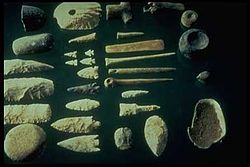 The Stone Age is a broad prehistoric period during which stone was widely used to make implements with a sharp edge, a point, or a percussion surface. The period lasted roughly 3.4 million years, and ended between 4500 BC and 2000 BC with the advent of metalworking. Stone Age artifacts include tools used by humans and by their predecessor species in the genus Homo, as well as the earlier partly contemporaneous genera Australopithecus and Paranthropus. Bone tools were used during this period as well, but are more rarely preserved in the archaeological record. The Stone Age is further subdivided by the types of stone tools in use.