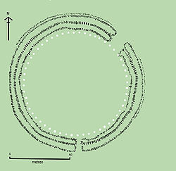 The first monument consisted of a circular bank and ditch enclosure made of Late Cretaceous ( Santonian Age) Seaford Chalk, (7 and 8) measuring around 110 metres (360 ft) in diameter with a large entrance to the north east and a smaller one to the south (14). It stood in open grassland on a slightly sloping but not especially remarkable spot. The builders placed the bones of deer and oxen in the bottom of the ditch as well as some worked flint tools. The bones were considerably older than the antler picks used to dig the ditch and the people who buried them had looked after them for some time prior to burial. The ditch itself was continuous but had been dug in sections, like the ditches of the earlier causewayed enclosures in the area. The chalk dug from the ditch was piled up to form the bank. This first stage is dated to around 3100 BC after which the ditch began to silt up naturally and was not cleared out by the builders. Within the outer edge of the enclosed area was dug a circle of 56 pits, each around 1 metre (3.3 ft) in diameter (13), known as the Aubrey holes after John Aubrey, the seventeenth century antiquarian who was thought to have first identified them. The pits may have contained standing timbers, creating a timber circle although there is no excavated evidence of them. A small outer bank beyond the ditch could also date to this period.