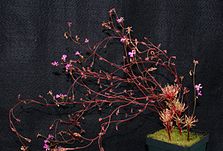 The genus Stylidium (also known as triggerplants or trigger plants) are a group of dicotyledonous plants that belong to the family Stylidiaceae. The genus name Stylidium is derived from the Greek στυλος or stylos (column or pillar), which refers to the distinctive reproductive structure that its flowers possess. Pollination is achieved through the use of the sensitive "trigger", which comprises the male and female reproductive organs fused into a floral column that snaps forward quickly in response to touch, harmlessly covering the insect in pollen. Most of the approximately 300 species are only found in Australia, making it the fifth largest genus in that country. Triggerplants are considered to be protocarnivorous or carnivorous because the glandular trichomes that cover the scape and flower can trap, kill, and digest small insects with protease enzymes produced by the plant.