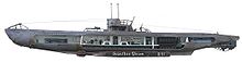 U-995, Type VIIC/41 U-Boat of WWII, showing the typical combination of ship-like non-watertight outer hull with bulky strong hull below
