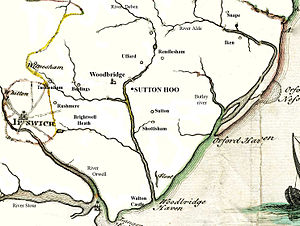 Sutton Hoo in relation to Gipeswic (Ipswich) and the Wicklaw