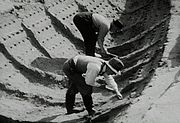Mrs Pretty still wanted a full excavation of Mound 1 and, in May 1939, Brown began work helped by the gamekeeper and the gardener. Driving a trench from the east end they discovered ship-rivets in position, and the colossal size of the find began to dawn on them. After patient weeks of clearing out earth from within the ship's hull they reached the burial chamber and realised it was undisturbed. It lay beneath the exact spot where Mrs Pretty had told him to dig a year previously.