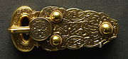 The "great" gold buckle is made in three parts. The plate is a long ovoid of meandering but symmetrical outline with densely interwoven and interpenetrating Style II ribbon animals rendered in chip-carving on the front. The gold surfaces are punched to receive niello detail. The plate is hollow and has a hinged back, forming a secret chamber possibly for a relic. Both the tongue-plate and hoop are solid, ornamented, and expertly engineered. Garnet is not employed in this object.
