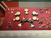 Of the two cremations excavated in 1938 Mound 3 contained the ashes of a man and a horse placed on a wooden trough or dugout bier, together with an iron-headed throwing-axe, a Frankish weapon. The grave also contained objects imported from the eastern Mediterranean area, including the lid of a bronze ewer, part of a miniature carved plaque depicting a winged Victory, and fragments of decorated bone from a casket of similar origin. The other, Mound 4, was the cremation of a man and a woman with a horse and perhaps also a dog. This included a few fragments of bone gaming-pieces.