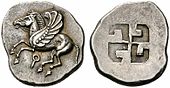 - tetraskelion (Greek: τετρασκέλιον), literally meaning "four legged", especially when composed of four conjoined legs (compare triskelion (Greek: τρισκέλιον)).