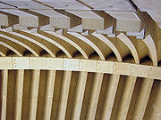 - The interior designs: Utzon's plywood corridor designs, and his acoustic and seating designs for the interior of both major halls, were scrapped completely. His design for the Concert Hall was rejected as it only seated 2000, which was considered insufficient. Utzon employed the acoustic consultant Lothar Cremer, and his designs for the major halls were later modelled and found to be very good. The subsequent Todd, Hall and Littlemore versions of both major halls have some problems with acoustics, particularly for the performing musicians. The orchestra pit in the Opera Theatre is cramped and dangerous to musicians' hearing. The Concert Hall has a very high roof leading to lack of early reflections onstage - perspex rings (the "acoustic clouds") hanging over the stage were added shortly before opening in an (unsuccessful) attempt to address this problem.