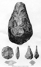 The earliest stone tools were crude, being little more than a fractured rock. In the Acheulian era, beginning approximately 1.65 million years ago, methods of working these stone into specific shapes, such as hand axes emerged. The Middle Paleolithic, approximately 300,000 years ago, saw the introduction of the prepared-core technique, where multiple blades could be rapidly formed from a single core stone. The Upper Paleolithic, beginning approximately 40,000 years ago, saw the introduction of pressure flaking, where a wood, bone, or antler punch could be used to shape a stone very finely.