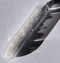 Terbium sulfate, Tb2(SO4)3 (top), fluoresces green under ultraviolet light (bottom)