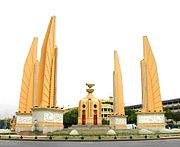 Bangkok's Democracy Monument: a representation of the 1932 Constitution sits on top of two golden offering bowls above a turret.