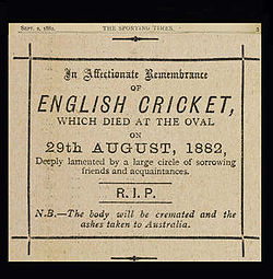 The series is named after a satirical obituary published in a British newspaper, The Sporting Times, in 1882 after a match at The Oval in which Australia beat England on an English ground for the first time. The obituary stated that English cricket had died, and the body will be cremated and the ashes taken to Australia. The English media dubbed the next English tour to Australia (1882–83) as the quest to regain The Ashes.