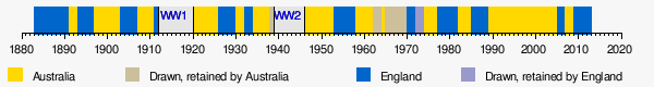 In 1896 England under the captaincy of W G Grace won the series 2–1, and this marked the end of England's longest period of Ashes dominance.