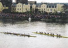 Oxford boats from Westminster School Boat Club (left), and Cambridge from King's College School Boat Club (right). Both clubs are near the Start, just downstream of the Black Buoy. The crews warm up by rowing downstream below Putney Bridge before taking their places at the start. | |