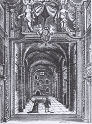 View of the stage of the Dorset Garden Theatre, as it was pictured in the libretto of The Empress of Morocco (1673), see Elkanah Settle.