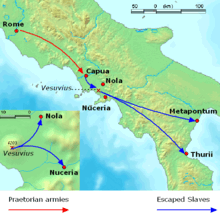 | 120,000 escaped slaves and gladiators, including non-combatants; total number of combatants unknown | 3,000+ militia 8 Roman legions (40,000–50,000 men) 12,000+ other troops |