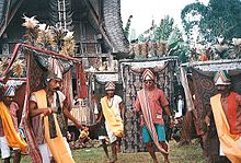 The word toraja comes from the Bugis language's to riaja, meaning "people of the uplands". The Dutch colonial government named the people Toraja in 1909. Torajans are renowned for their elaborate funeral rites, burial sites carved into rocky cliffs, massive peaked-roof traditional houses known as tongkonan, and colorful wood carvings. Toraja funeral rites are important social events, usually attended by hundreds of people and lasting for several days.