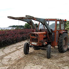 A front-loader or loader is a tractor with an engineering tool which consists of two hydraulic powered arms on either side of the front engine compartment and a tilting implement. This is usually a wide-open box called a bucket, but other common attachments are a pallet fork and a bale grappler.