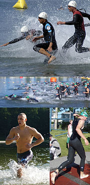A triathlon is a multi-sport endurance event consisting of swimming, cycling, and running in immediate succession over various distances. Triathletes compete for fastest overall course completion time, including timed "transitions" between the individual swim, bike, and run components.