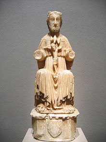 By the end of the 15th century, larger representations, other than the Throne of Mercy, became effectively standardised, showing an older figure in plain robes for the Father, Christ with his torso partly bare to display the wounds of his Passion, and the dove above or around them. In earlier representations both Father, especially, and Son often wear elaborate robes and crowns. Sometimes the Father alone wears a crown, or even a papal tiara.