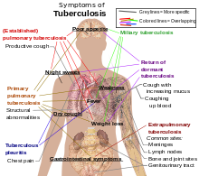 About 5–10% of those without HIV, infected with tuberculosis, develop active disease during their lifetimes. In contrast, 30% of those coinfected with HIV develop active disease. Tuberculosis may infect any part of the body, but most commonly occurs in the lungs (known as pulmonary tuberculosis). Extrapulmonary TB occurs when tuberculosis develops outside of the lungs. Extrapulmonary TB may coexist with pulmonary TB as well. General signs and symptoms include fever, chills, night sweats, loss of appetite, weight loss, and fatigue, and significant finger clubbing may also occur.