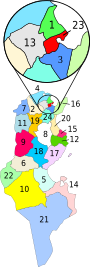 Tunisia is subdivided into 24 governorates, which are further divided into 264 " delegations" or " districts" (mutamadiyat), and further subdivided into municipalities (shaykhats) and sectors (imadats).