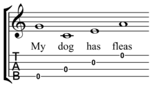 The most common tuning is C6-tuning: G4 C4 E4 A4. The G string is tuned an octave higher than might be expected. This is known as reentrant tuning. Some prefer "Low G" tuning on the tenor, with the G in sequence an octave lower. The baritone is usually tuned to D3 G3 B3 E4, which is the same as the highest four strings of the standard 6-string guitar. (A simple melody is so widely used as an aid in tuning that the ukulele has been referred to as the "My Dog Has Fleas" instrument.)