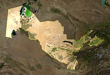 Uzbekistan is a dry, landlocked country. It is one of two doubly landlocked countries in the world — that is, a country completely surrounded by landlocked countries — the other being Liechtenstein. In addition, due to its location within a series of endorheic basins, none of its rivers lead to the sea. Less than 10% of its territory is intensively cultivated irrigated land in river valleys and oases. The rest is vast desert ( Kyzyl Kum) and mountains.