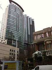 The original BC Hydro headquarters building at Nelson and Burrard Streets is a modernist high-rise, now converted into the Electra condominiums. Also notable is the "concrete waffle" of the MacMillan-Bloedel building on the north-east corner of the Georgia and Thurlow intersection. A prominent addition to the city's landscape is the giant tent-frame Canada Place, the former Canada Pavilion from the 1986 World Exposition, which includes part of the Convention Centre, a Cruise Ship Terminal and the Pan-Pacific Hotel. Two modern buildings that define the southern skyline are City Hall and the Centennial Pavilion of Vancouver Hospital, both designed by Townley and Matheson in 1936 and 1958 respectively.