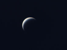 Venus in approximately true-color, a nearly uniform pale cream, although the image has been processed to bring out details.[1] The planet's disk is about three-quarters illuminated. Almost no variation or detail can be seen in the clouds.