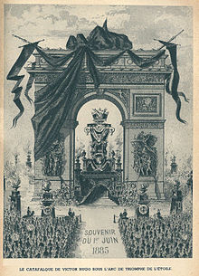 Victor Hugo's death on 22 May 1885, at the age of 83, generated intense national mourning. He was not only revered as a towering figure in literature, he was a statesman who shaped the Third Republic and democracy in France. More than two million people joined his funeral procession in Paris from the Arc de Triomphe to the Panthéon, where he was buried. He shares a crypt within the Panthéon with Alexandre Dumas and Émile Zola. Most large French towns and cities have a street named after him.