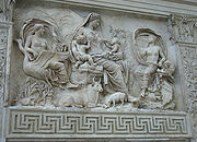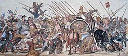 Paintings of human figures can be found in the tombs of ancient Egypt. In the great temple of Ramses II, Nefertari, his queen, is depicted being led by Isis. The Greeks contributed to the development of painting but much of their work has been lost. One of the best remaining representations is the mosaic of the Battle of Issus found at Pompeii which was probably based on a Greek painting. Greek and Roman art contributed to Byzantine art in the 4th century BC which initiated a tradition in icon painting.