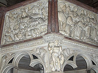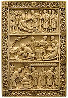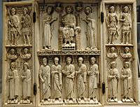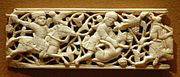 Islam is famously aniconic, so the vast majority of sculpture is arabesque decoration in relief or openwork, based on vegetable motifs, but tending to geometrical abstract forms. In the very early Mshatta Facade (740s), now mostly in Berlin, there are animals within the dense arabesques in high relief, and figures of animals and men in mostly low relief are found in conjunction with decoration on many later pieces in various materials, including metalwork, ivory and ceramics.