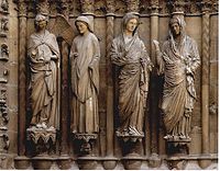 Towards the end of the long Neolithic Jōmon period, some pottery vessels were "flame-rimmed" with extravagant extensions to the rim that can only be called sculptural, and very stylized pottery dogū figures were produced, many with the characteristic "snow-goggle" eyes. During the Kofun period of the 3rd to 6th century CE, haniwa terracotta figures of humans and animals in a simplistic style were erected outside important tombs. The arrival of Buddhism in the 6th century brought with it sophisticated traditions in sculpture, Chinese styles mediated via Korea. The 7th century Hōryū-ji and its contents have survived more intact than any East Asian Buddhist temple of its date, with works including a Shaka Trinity of 623 in bronze, showing the historical Buddha flanked by two bodhisattvas and also the Guardian Kings of the Four Directions.