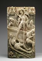 From the many subsequent periods before the ascendency of the Neo-Assyrian Empire in the 10th century BCE Mesopotamian art survives in a number of forms: cylinder seals, relatively small figures in the round, and reliefs of various sizes, including cheap plaques of moulded pottery for the home, some religious and some apparently not. The Burney Relief is an unusual elaborate and relatively large (20 x 15 inches) terracotta plaque of a naked winged goddess with the feet of a bird of prey, and attendant owls and lions. It comes from the 18th or 19th centuries BCE, and may also be moulded. Stone stelae, votive offerings, or ones probably commemorating victories and showing feasts, are also found from temples, which unlike more official ones lack inscriptions that would explain them; the fragmentary Stele of the Vultures is an early example of the inscribed type, and the Assyrian Black Obelisk of Shalmaneser III a large and solid late one.