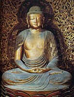 The wooden image (9th century) of Shakyamuni, the "historic" Buddha, enshrined in a secondary building at the Murō-ji, is typical of the early Heian sculpture, with its ponderous body, covered by thick drapery folds carved in the hompa-shiki (rolling-wave) style, and its austere, withdrawn facial expression. The Kei school of sculptors, particularly Unkei, created a new, more realistic style of sculpture.
