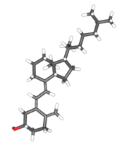 Calcitriol (1,25-dihydroxycholecalciferol). Active form. Note extra OH groups at upper right and lower right.