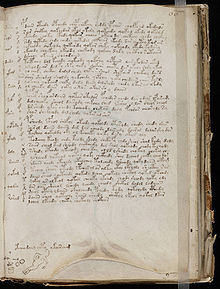 The text was clearly written from left to right, with a slightly ragged right margin. Longer sections are broken into paragraphs, sometimes with star- or flower-like " bullets" in the left margin. There is no obvious punctuation, and no indications of any errors or corrections made at any place in the document. The ductus flows smoothly, giving the impression that the symbols were not enciphered, as there is no delay between characters as would normally be expected in written encoded text. Whoever the scribe was, he or she was practiced in writing the script. However, such writing fluency could also be achieved by copying prepared coded text from some other source, such as a wax tablet or separate manuscript.