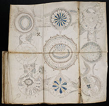- More circular diagrams, but of an obscure nature. This section also has foldouts; one of them spans six pages and contains a map or diagram, with nine "islands" or "rosettes" connected by " causeways" and containing castles, as well as what may possibly be a volcano.