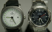 Radio time signal watches are a type of electronic quartz watch which synchronizes ( time transfer) its time with an external time source such as in atomic clocks, time signals from GPS navigation satellites, the German DCF77 signal in Europe, WWVB in the US, and others. Movements of this type may -among others- synchronize not only the time of day but also the date, the leap-year status of the current year, and the current state of daylight saving time (on or off). However, other than the radio receiver these watches are normal quartz watches in all other aspects.