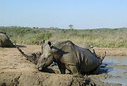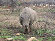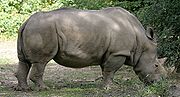The White Rhinoceros or Square-lipped rhinoceros (Ceratotherium simum) is one of the five species of rhinoceros that still exist and is one of the few megafauna species left. Behind the elephant, it is probably the most massive remaining land animal in the world, along with the Indian Rhinoceros and the Hippopotamus, which are of comparable size. It is well known for its wide mouth used for grazing and for being the most social of all rhino species. The White Rhino is the most common of all rhinos and consists of two subspecies, with the northern subspecies being rarer than the southern. The northern subspecies may have as few as 50 remaining world wide.