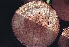 - "When the rings are wide, the transition from spring wood to summer wood is gradual, while in the narrow rings the spring wood passes into summer wood abruptly. The width of the spring wood changes but little with the width of the annual ring, so that the narrowing or broadening of the annual ring is always at the expense of the summer wood. The narrow vessels of the summer wood make it richer in wood substance than the spring wood composed of wide vessels. Therefore, rapid-growing specimens with wide rings have more wood substance than slow-growing trees with narrow rings. Since the more the wood substance the greater the weight, and the greater the weight the stronger the wood, chestnuts with wide rings must have stronger wood than chestnuts with narrow rings. This agrees with the accepted view that sprouts (which always have wide rings) yield better and stronger wood than seedling chestnuts, which grow more slowly in diameter."