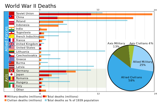 Of the total deaths in World War II, approximately 85 percent—mostly Soviet and Chinese—were on the Allied side and 15 percent on the Axis side. Many of these deaths were caused by war crimes committed by German and Japanese forces in occupied territories. An estimated 11 to 17 million civilians died as a direct or indirect result of Nazi ideological policies, including the systematic genocide of around six million Jews during The Holocaust along with a further five million Roma, homosexuals as well as Slavs and other ethnic and minority groups.