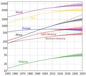 Below is a table with historical and predicted population figures shown in millions. The availability of historical population figures varies by region. (Note: These projections here are not kept up to date.) Please see World population estimates for more figures.