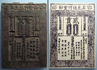 Yuan dynasty banknote with its printing plate, 1287.