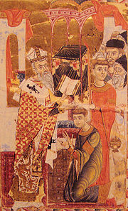 Archbishop John of Cilician Armenia, in a painting from 1287. His dress displays a Chinese dragon, an indication of the thriving exchanges with the Mongols during the period.