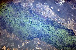 Eighty kilometres (50 mi) further down, the Luanginga, which with its tributaries drains a large area to the west, joins the Zambezi. A few kilometres higher up on the east the main stream is joined in the rainy season by overflow of the Luampa/ Luena system.