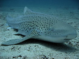 The zebra shark (Stegostoma fasciatum or varium) is a species of carpet shark and the sole member of the family Stegostomatidae. It is found throughout the tropical Indo-Pacific, frequenting coral reefs and sandy flats to a depth of 62 m (210 ft). Adult zebra sharks are distinctive in appearance, with five longitudinal ridges on a cylindrical body, a low caudal fin comprising nearly half the total length, and a pattern of dark spots on a pale background. Young zebra sharks under 50–90 cm (20–35 in) long have a completely different pattern, consisting of light vertical stripes on a brown background, and lack the ridges. This species attains a length of 2.5 m (8.2 ft).