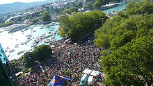 One of the largest and most popular annual events in Zurich is the Street Parade, which is also one of the largest techno and dance music festivals in the world. Proceeding along the side of Lake Zurich, it normally occurs on the second Saturday in August. The first edition was held In 1992 with about 1,000 participants. By 2001 the event had reached the size of 1 million participants. The Zürifäscht, on the other hand, is a triennial public festival. It features music, fireworks set to music, and other attractions throughout the old town. It is the largest public festival in Switzerland and is attended by up to 2 million visitors.